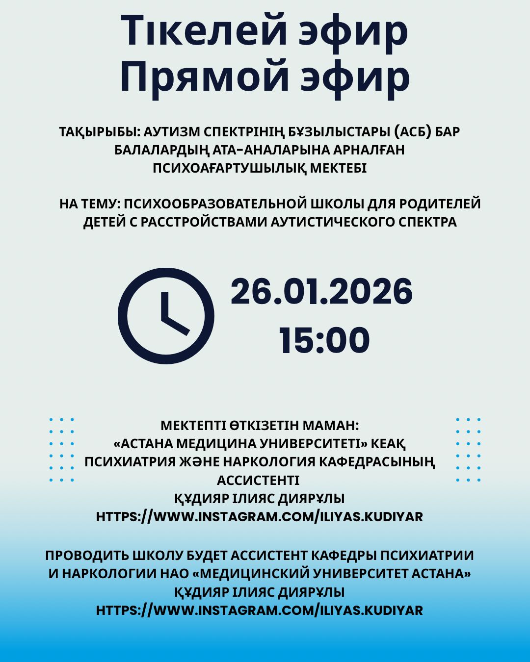 Тікелей эфир https://www.instagram.com/iliyas.kudiyar аккаунтында болады.