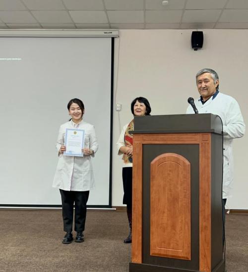 «Жаңа психикалық әсері бар заттардан туындайтын масаңдықтың клиникалық-диагностикалық ерекшеліктері» тақырыбындағы баяндама – 1-017R тобының резиденті Жасұзақова Гүлім Арқатқызы, жетекшісі – кафедра ассистенті Шабденов Мурагер Маратович.